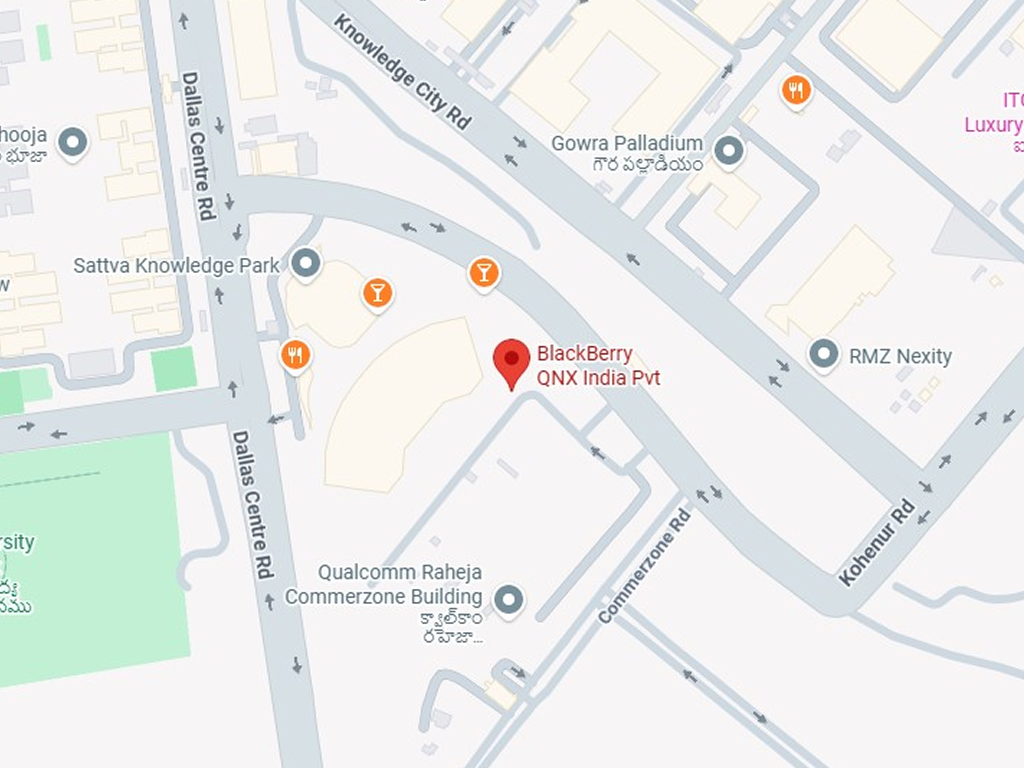 BlackBerry India Pvt Ltd, n.º 1301, 13.ª planta, KRC Commerzone, Hetero Wing, Madhapur, Durgam Cheruvu Rd, Vittal Rao Nagar, HITEC City, Hyderabad, Telangana, India 500032